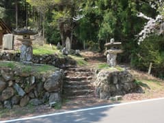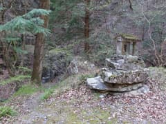 水量が増した松田川は所々で岩盤を穿って流れ、ミニ渓谷美を見せる。右岸から大きな支流を合わせる地点に「野山林道開設記念之碑」と「前坂道路改築記念碑」の二つの石碑がある。直ぐ先には大きな石祠があり、裏手に松田川の渓流を眺めるスポットがある。