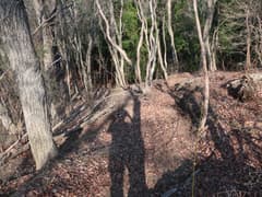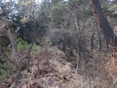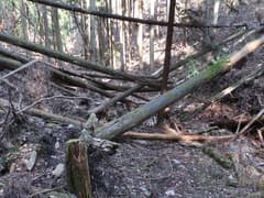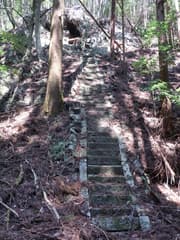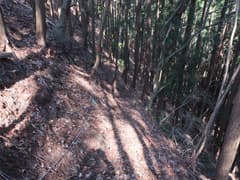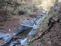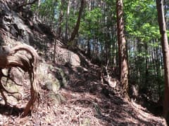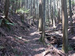 この道に入り、杉林に覆われて薄暗い急斜面を大きくジグザグを切って下る。やがて傾斜が緩み、周囲を高い岩場に囲まれた谷に沿って下る。途中、倒木が折り重なって谷を塞ぐが、屈んでうまく通り抜けられる。