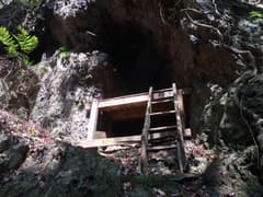 渓流沿いに山道を辿ると、すぐに2本目の黄色標柱があり、巡視路が右に分岐。沢を渡って左岸の尾根に向かっている。ここは道了大権現に向かって直進。左岸に渡って石組みの堰堤を越えると、左岸の急斜面に長い石段が現れ、大きな岩場の中腹の岩窟に通じている。これは期待以上に興味深い場所だ。石段の取り付きには「不動明王」の石碑がある。どこかに滝があるのかな。石段を上がり、さらに岩場と梯子を登って岩窟の中に入ると、朽ちかけた木の祠があった。