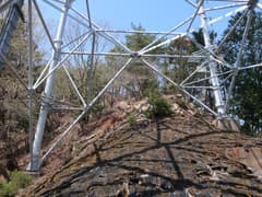 道了大権現の探訪とお参りを済ませ、石段を降りる。石段の右側の斜面を見上げると、木立を透かして送電鉄塔が見えているので、巡視路の分岐まで戻らず、直接、送電鉄塔に向かう。杉林の急斜面を斜めに上がり、灌木のちょい藪を抜けて、枝尾根の上の明瞭な道型(=巡視路)に合流する。僅かに左へ登ったところに送電鉄塔が建つ。