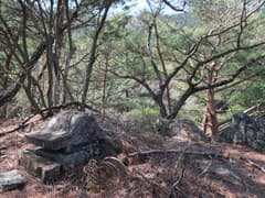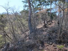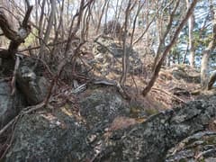 送電鉄塔の先は、風化した岩場が断続する明るい尾根が続く。藪はなく、歩き易い。小ピークに登り着くと、塔身がなくなった石祠がある。小さなアップダウンを交えた岩尾根を緩々と登って行く。途中、岩場に古いロープが張られていたり、古い赤テープを見かける。薄い踏み跡もあるし、そこそこ歩かれているようだ。