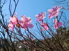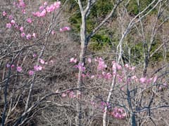 最後は岩場混じりの急坂を上ると、猪子峠と猪子山の間の登山道に合流する。ここから仙人ヶ岳へは、岩場の多いハイキングコースだ。右下の眼下にまつだ湖の湖面と湖畔の桜を見る。チラホラとアカヤシオが咲いているが、数は少ない。