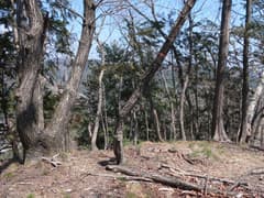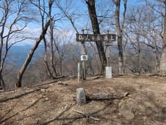 最後にひと登りして、ハイカーさんが途切れて無人の仙人ヶ岳頂上に着く。木立の間から北面を眺めると、遠くの山々はやはり霞んでいるが、全く雪が見えない袈裟丸山と皇海山、まだ白く冠雪している日光白根山を見出だす。頂上でジッとしていると、流石に少し風が冷たい。パンの残りを食べたら、下山にかかろう。