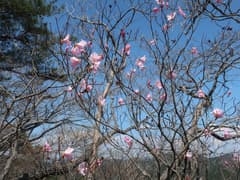 やがて、今シーズン初のアカヤシオに遭遇。もう終盤の様子だが、ピンクの花が青空に映える。この先に期待だな。周囲の山肌には新緑が芽吹いて、点々と白いヤマザクラが咲いている。見晴らしの良い露岩があり、右後方に小さいながらもどっしりとした赤雪山の山容を望む。