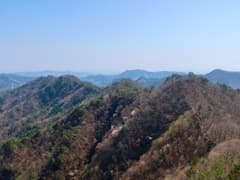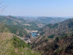 登り着いた知ノ岳から振り振り返ると、桜に縁取られた「まつだ湖」を俯瞰し、辿って来た稜線が眺められる。気温が高いため、遠くの山並には霞がかかっている。