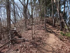 復路は、まだ歩いたことがない野山林道のコースを下ってみる。赤雪山への縦走路に入り、固定ロープが張られた短い急坂を下ると、すぐに右斜面へ下る道が分岐する。