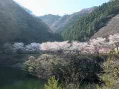 ここまで来れば、まつだ湖は近い。野山橋を渡り、少し傾き始めた陽射しに照らされた桜並木を眺めつつ、湖左岸の道路を歩く。湖面の向こうの「まつだ湖畔キャンプ場」の桜も満開で、駐車が多いところを見ると、行楽客で賑わっているようだ。