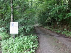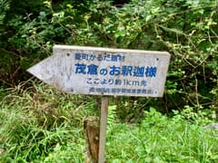 この先で「茂倉のお釈迦様 ここより約1km先」の道標に従って、左に分岐する作業道(林道茂倉支線)に入る。作業道入口には重機が置かれ、何やら工事が始まっている(今日は休日なので作業はなし)。工事区間は直ぐに終わり、杉林に囲まれた沢に沿って荒れた作業道を緩く登っていく。