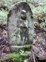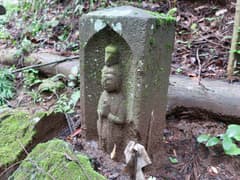 作業道を歩きつつ、ふと左を見て、少し高い所に石仏がひっそりとあることに気が付く。これも馬頭観音かな。何やら銘があり、元文の文字が読み取れる。ますます荒れた作業道を辿り、たびたび沢を渡り返す。谷が左に折れて岩壁が迫ると、作業道は終点となる。
