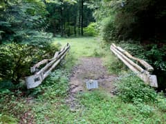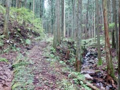 谷が右に折れると穏やかな道となり、緊張が解れる。やがて作業道に出て、短い橋で支流の沢を渡る。