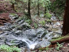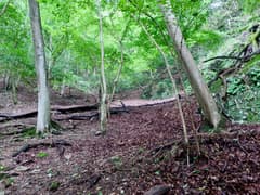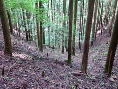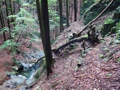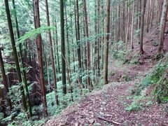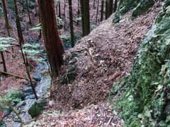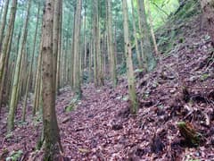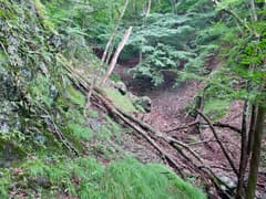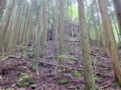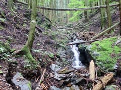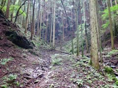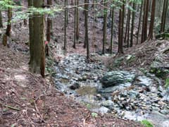 岩場を過ぎると樹林に覆われた穏やか尾根となり、グングン高度を下げる。最後は植林帯に入り、傾斜がきつくなってきたので、けもの道を辿って比較的緩やかな右斜面に降りる。植林中の浅い窪に入って下ると、程なく朝日沢の支流に着く。