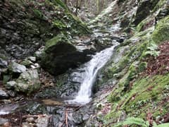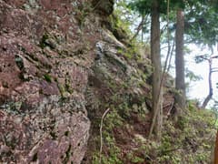 岩窟の左脇には細々と水を落とす滝がかかっている。雨が降らなければ、水は涸れそうである。滝の左から回り込み(赤テープあり)、岩壁をトラバースして滝の上に出る。なお、岩窟の左上の尾根上には座禅岩と呼ばれる岩があるそうだが、訪問しそびれた。