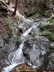 角を曲がると谷が狭まり、小さな滑滝が現れる。小滝と言っても登山靴では濡れた岩肌は滑り易く、要注意。続いて二段の小さな滑滝を越える。