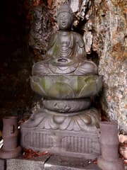 やがて谷が広がって、三方を岩壁に囲まれた緩斜面に入る。正面の岩壁には大きな岩窟があり、あれが仙人窟のようだ。杉林の間を登って岩窟の前に着く。岩窟の入口には石灯籠があり、中には釈迦如来の定印坐像の石仏が祀られている。想像以上に大きく、立派な石仏だ。肌理も滑らかで、ほとんど風化していない。これは見に来た甲斐があった。