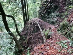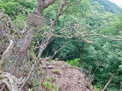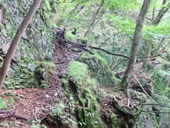 現在は桟道はなく、その代わり、幅は狭いが、歩く人が増えたのか良く踏まれた山道となって、通り易くなった気がする。とは言え、崩落した個所が一つあり、固定ロープで下から迂回したり、高度感のある道がしばらく続いて、滑落したらただではすまないので、注意して歩く。
