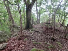 県境稜線を東へ進み、枯れ木と露岩の多い小ピークに着く。帰りはここから北に落ちる尾根を下る予定だ。山火事跡地はこの辺りまでで、樹林帯に入って緑陰のある稜線を辿り、仙人ヶ岳の頂上に登り着く。