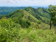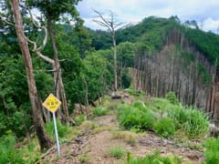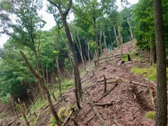頂上から仙人ヶ岳に向かって急坂を降りると、小ピークを連ねた稜線の先に仙人ヶ岳の頂がこんもりと盛り上がっているのが見渡せる。稜線の右(南)側は山火事跡地の伐採斜面だが、左(北)斜面の朝日沢源流域は鬱蒼とした樹林に覆われている。仙人ヶ岳の一つ手前のピークから朝日沢に落ちる尾根が見える。今日は仙人ヶ岳まで足を延ばして、あの尾根を下る予定だ。