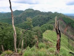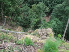 振り返ると、半身がススキに覆われた伐採斜面となった前仙人ヶ岳を仰ぐ。この辺りが山火事の傷跡が一番深いように思う。稜線の左(北)側も根返りの倒木が多く、あちこちで地盤が崩落している。稜線上には、草藪と言う程ではないが、ススキが蔓延っている。