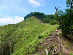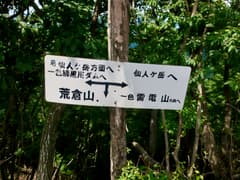 焼けて倒れた木々の脇を登り、小さくアップダウンする稜線を進む。木陰がなく、陽射しを浴びて、かなり暑い。群馬・栃木県境上の小ピークに着くと「↓荒倉山 一色雷電山方面」の道標がある。荒倉山へのルートは山火事後に一度歩いたこと(山行記録)があり、現在も(ススキに覆われかけてはいるが)通行可能だ。