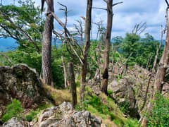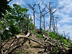 小さなアップダウンのある細尾根を辿ると、山火事で疎らとなった斜面が現れる。最後に短い急坂を上がって、連続3回目となる前仙人ヶ岳の頂上に着く。
