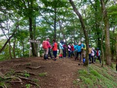 到着時の頂上は無人で、さすがに8月に600m級の低山に登る物好きはいないよなー、と思ったら、反対側から年配ハイカーさんの団体がワイワイと登って来て、頂上はガヤガヤと大賑わいになった。コロナ、眼中になさそう(^^;)。団体から距離をとって一休みする。