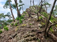やがて団体さんが下山し、静まり返った頂上を私も後にする。往路を少し戻り、小ピークから北に落ちる尾根に入る。踏み跡はないが藪もなく、問題なく歩ける。しばらく山火事跡が続き、露出した岩の間にアカマツの幼樹が育って、黄緑色の若葉を拡げている。これがもっと成育すると、ちょっと厄介な藪になりそうだ。