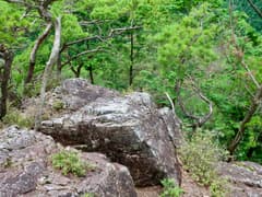 尾根を小さくアップダウンして進むと、松に囲まれた露岩の瘤に着く。この辺りは良い展望が得られ、緑に包まれた仙人ヶ岳や朝日沢の谷間を隔てて前仙人ヶ岳を眺めることができ、600m級の低山にしてはなかなか山深い趣きがある。