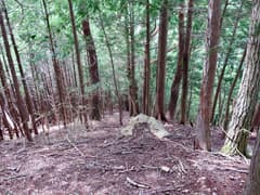 一直線に急坂を詰め上げて、ようやく前仙人ヶ岳北尾根の上に登り着く。この地点には赤テープあり。ここと前仙人ヶ岳の間は、前回の山歩きで逆向きに歩いたばかりのところだ。古びたロープが下がる小さな岩場を過ぎ、少し登り返した所がつなぎ石跡で、紹石山神の石祠が残っている。