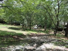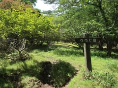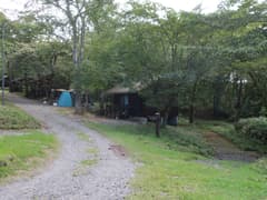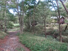 サクサク下り、三叉路は左の道へ。水道施設を過ぎると広い道となり、やがて右手にバンガローが見えて来る。バンガローの脇を通ると森林公園のWCの前の道に出た。こちらの道を登路にする場合、道標がないので入口がちょっと分かりにくい。