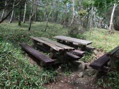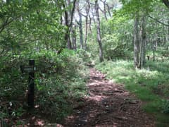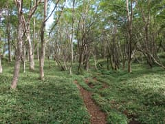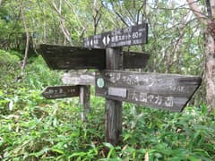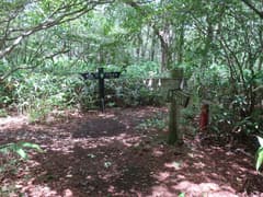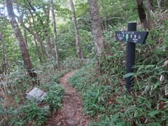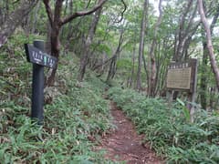 三叉路から緩斜面を登ると、関東ふれあいの道の「←花見ヶ原 1.0km 黒檜山 3.0km→」の道標と「赤城の鳥類」の説明板がある。以降、0.5km間隔で道標が設置され、特徴的な地形のない茫洋とした尾根に通じる道なので、どこまで来たかすぐに分かって役に立つ。