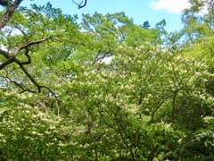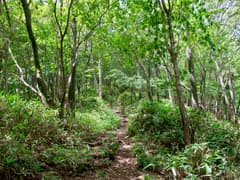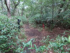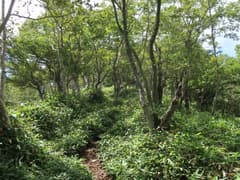 森林公園のテントサイトには、夏休みをアウトドアで楽しむ家族連れのテントがポツポツある。総合案内所の右脇を登ってテントサイトの間を登り、つつじ園に入る。前回、5月に花見ヶ原〜黒檜山を歩いたときは、ヤマツツジが満開だった(山行記録)。今日はもちろん緑一色。生い茂った枝葉を潜りつつ小道を辿ると、関東ふれあいの道(黒檜山から花見ヶ原へのみち)に出る。樹林と笹に覆われた平坦な道を辿り、森林公園からの林間歩道と三叉路で合流する。