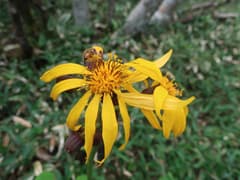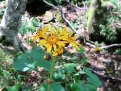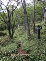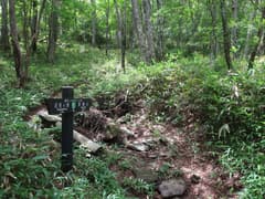 周囲は湿った草地で、点々とマルバダケブキが咲く。小沢が流れ、手を浸すと冷たくて気持ち良い。再び笹原に入り、緩く登ると朽ちかけたベンチと「赤城のツツジ」の説明板があり、その少し先に3.0km地点の道標が立つ。