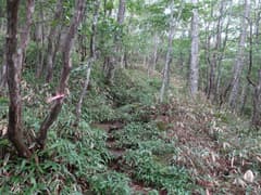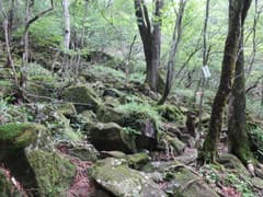 1.0km地点からしばらく右斜面をトラバースし、切り返して尾根上に出る。尾根を淡々と登り、1.5km地点を通過。右側の緩斜面に入り、苔むした転石の斜面をトラバースする。ほどなく、2.0km地点の道標があり、黒檜山へも2.0kmだからちょうど中間点だ。