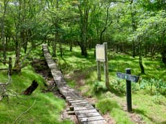 中間点で道は大きく左にカーブして、再び転石の斜面に入る。最近の雨降りのせいか、転石の間には水流がある。緩斜面の登りとなり、朽ちて滑り易そうな木道を辿ると、2.5km地点の道標と「シラカバとダケカンバ」の説明板がある。この場所は、残雪期にスノーシューで登ったとき(山行記録)も写真を撮っていて、見覚えがある。