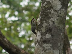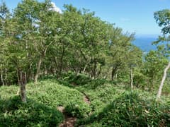 丈の低い笹原の尾根を登る。すぐ近くでギーというセミの鳴き声がするので、音の源を探すと、道端の木の幹にいた。写真には写っていないが、黒地の背中に黄色の逆M字の模様があり、後日調べるとエゾゼミという種類のセミらしい。