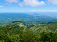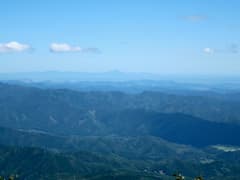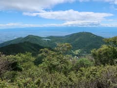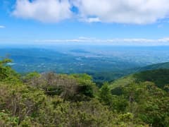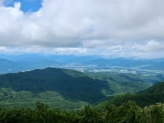 3.5km地点の道標を通過し、中低木と笹原に覆われた稜線を登る。雲の動きが速く、どんより曇ったかと思うと、青空が覗いて強い日差しが降り注ぐ。標高が上がって、左に関東平野の眺めが開ける。山地の上の雲は厚いが、平野の上に流れた雲は蒸発して、青空が広がっている。桐生市街は相変わらず暑いだろうな。
