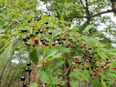 花見ヶ原への道に入り、絶景スポットからもう一度展望を楽しんだのち、笹原の道を下る。途中、黒い実をたくさん付けた木があるのに気が付く。美味そうな実だが、食べられるのか知らないので、口に入れるのは止めておく(後日調べると、多分、ウワミズザクラ。実はあまり美味しくないらしい)。