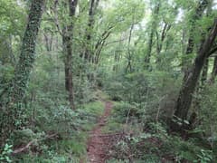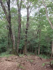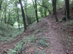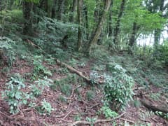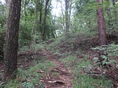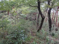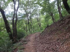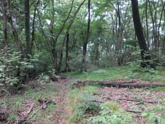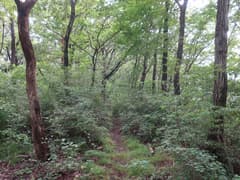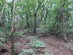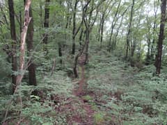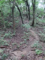 途中、木立が切れて陽当たりの良い個所は藪っぽい。急斜面に差し掛かり、ジグザグを切って登ると先程の小ピークに着く。ここからは雑木林に覆われたなだらかな尾根となり、小さくアップダウンして進む。登り始めに聞こえていたR50からの走行音も消え、里山にしては奥深い雰囲気がある。