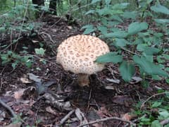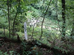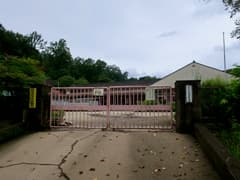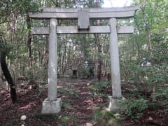 雷電神社は左岸の山中にあるはずだが、ここまで来ても参道入口らしきものは皆目見当たらない。仕方なく、砂防堰堤の少し手前で左岸の斜面に取り付く。雑木と竹の林に覆われて、深い藪はないが蜘蛛の巣と藪蚊が多く、腐葉土にでかいキノコが大量に生えて朽ち果てており、薄暗くジメジメしてあまり気分は良くない。訪れる季節を間違えた。そんな山林の中に雷電神社の小さな社殿を見出す。神社の周辺にも参道の痕跡はなく、参拝者が途絶えて廃れた雰囲気が濃い。