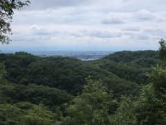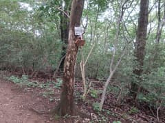 雷電山の頂上(246m標高点)は平坦で、ピークは判然としない。その先に平たい大岩(展望岩)があり、木立の切れ間から八王子丘陵主脈の菅塩峠や、その向こうの関東平野が見える。少し陽が射して、ツクツクホーシやミンミンゼミが盛んに鳴いている。さらに尾根を辿り、主脈上の縦走路に合流する。ここには、今回の山歩きの切っ掛けとなった「南部保育園方面」と「展望岩250m」の道標がある。