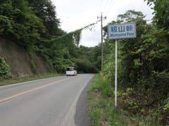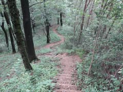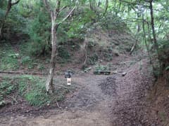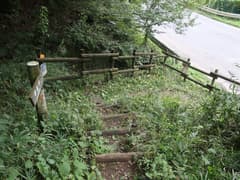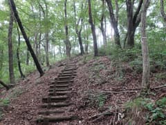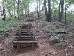 意外と尖ったピークの245m標高点へ、木の階段道を急登する。頂上を越えるとなだらかな尾根となり、左下の県道から車の走行音が聞こえてくる。ここで、犬を連れたソロハイカーさんと交差する。階段道を急降下し、小さな沢沿いに下ると県道に出る。以前は、沢筋にタイヤが不法投棄されていて、最低最悪の雰囲気だったが、縦走路が整備されて、きれいさっぱり片付いている。