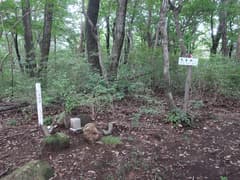 縦走路はこの先で、天王山・八王子公園墓地への道を左に分ける。天王山まで僅かな距離だから、立ち寄って行く。立派な歩道を緩く下り、鞍部から斜面を急登。広く平坦な尾根に出て少し進むと天王山頂上で、三角点標石と「標高太田市第3位」と記された山名標識がある。すぐ西側にゴルフ場があるためか、拾われたロストボールが数個、三角点標石にお供えされている。樹林に囲まれて展望皆無。長居せずに引き返す。