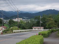 あとは車道を歩く。すぐに籾山峠を越え、右に広大な岩石採取場を見る。入口の岩石採取標識によると粘板岩を採取しているとのこと。坂道の途中から桐生市街を眺めると、濃い緑に覆われ、灰色の雲が垂れ込める鳴神山稜を背景として、山ん中だなーとの感が深い。