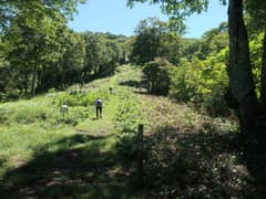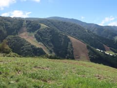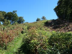 途中からゲレンデ脇の樹林中に入り、丈の高い笹の切り開き道を登る。地面が粘土質で少々滑りやすい。再びゲレンデを登って、左から上がって来たダート道に合流する。右に分岐する道はすぐ先の小毛無山(1450m)に通じ、頂上には展望台が建つ。毛無山の方が高くて展望が良いだろうから、小毛無山は割愛。ダート道からゲレンデ内の道型に入る。