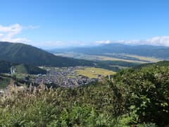 まず東には、横手山ののっそりとした山容が大きく、山腹を横切る志賀草津道路が見える。横手山から右へ長野・群馬県境稜線が松川源流域の奥深い谷を囲繞して延び、これまたのっそりした山容の御飯岳に至る。県境稜線の奥には白茶けた山肌を晒す草津白根山を望み、頂に雲が掛かった浅間連峰を遠望する。西側の笠岳峠は樹林に遮られて見えないが、山腹をうねって下る県道や、遥かに中野市街を俯瞰する。