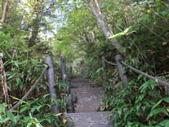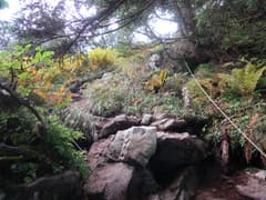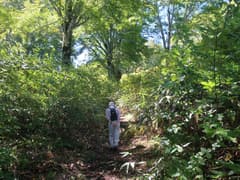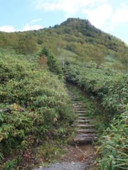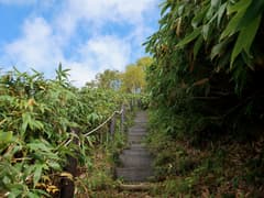 峠の茶屋(現在、改装中)のWCをお借りしたのち、裏手の登山道に取り付く。階段道が良く整備されている。ハイカーさんの行き来が多い。笹斜面を大きくジグザグを切って登ったのち、梯子かと思うような急な階段道に入る。段差が高く、意外と息が上がる。