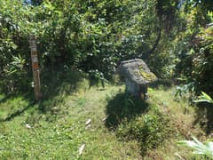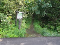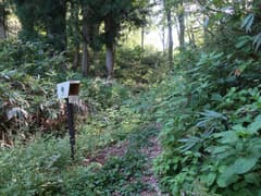 電波塔の前に「毛無山頂」の標識があり、その右の低木藪の中に石祠と三角点標石、赤滝登山道の標識がある。赤滝登山道を入口から覗くと藪を切り開いた急な山道だ。赤滝は地形図に記載があり、大いに興味を惹かれる。