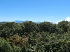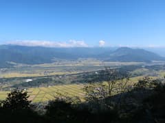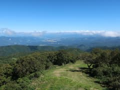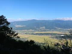 展望台からは西を除く三方に向かって展望がある。まず北には上ノ平の広くなだらかな尾根が広がり、その向こうには関田山脈が長々と横たわる。山腹のパッチワーク状の農地が良いアクセントだ。関田山脈に沿って目を右に転じると、深い緑に覆われた山地の中に津南付近の田園の浅い緑が広がる。