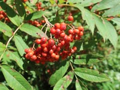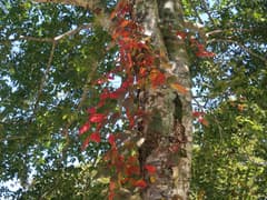 展望台を降り、山名標識の傍らでペットボトル飲料を飲んで一休みした後、往路を戻る。ゲレンデを下ると、妙高山と火打山にかかっていた雲がだいぶ取れて、二つの頂がよく見える。周囲の木々は色付き始めて、ハッと目を引く赤い物もときどきある。