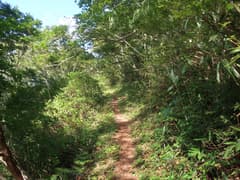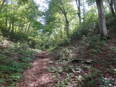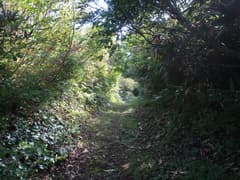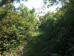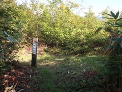 池から左に折れて山腹をトラバースすると稜線に登り着き、左に鷹落山への道を分ける。黒岩山は右へ稜線を辿る。稜線は平坦で低木に覆われ、展望はない。道は幅広く、良く刈り払いされている。たぶん、昔の作業道ではないかと思う。
